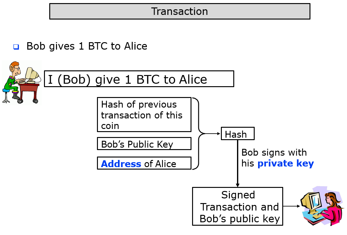 Assume that Bob intends to transfer one bitcoin to Alice. Here's how this transaction would technically unfold: